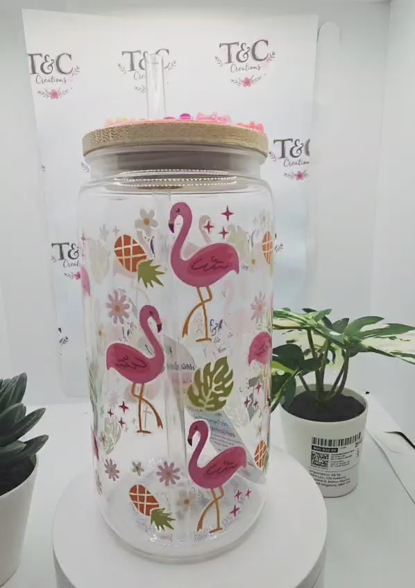Sip in style with this fabulous 16 oz acrylic tumbler featuring a vibrant flamingo decal that brings tropical flair to your daily routine. The sturdy acrylic construction keeps your drinks at the perfect temperature, while the eye-catching gemmed lid adds a touch of sparkle and glamour. Perfect for iced coffee, cocktails, or cold beverages, this tumbler is an instant conversation starter. Whether you're lounging by the pool or heading to the office, let your inner flamingo shine!