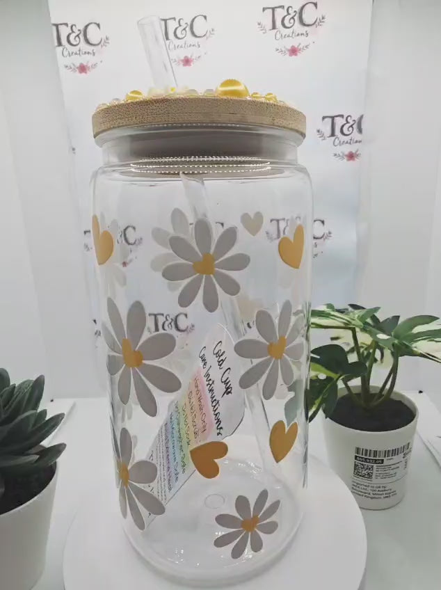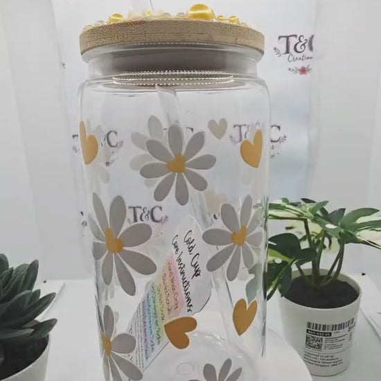 Sip in style with this charming 16 oz glass tumbler, adorned with a delightful daisy and hearts decal that brings a cheerful pop of personality to your daily drinks. The sturdy glass construction keeps your beverages at the perfect temperature, while the eye-catching gemmed lid adds a touch of sparkle and keeps your drink secure on the go. Perfect for Ice’d coffee, smoothies, or cold drinks—a delightful companion for anyone who loves a little floral charm with their hydration!