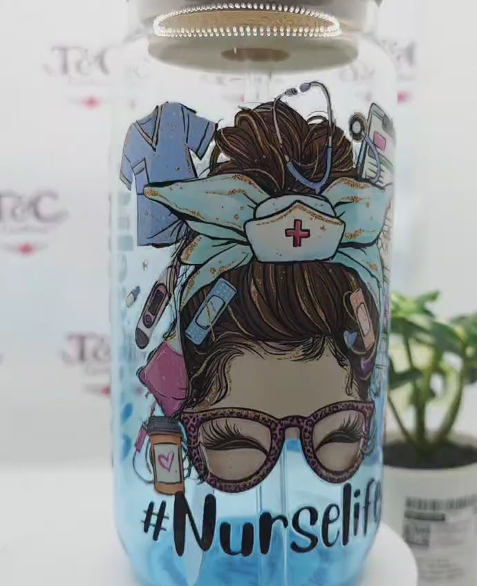 Cheers to the hardworking heroes in scrubs! This 16 oz glass tumbler features a cheeky "Nurse Life" decal that celebrates those who keep us all going. Topped with a sparkling gemmed lid, it's the perfect companion for coffee, tea, or whatever keeps you powered through those long shifts. Durable glass construction means it'll handle the hustle, while the eye-catching design makes it a conversation starter in any break room. A thoughtful gift for nurses who deserve a little sparkle with their caffeine fix.