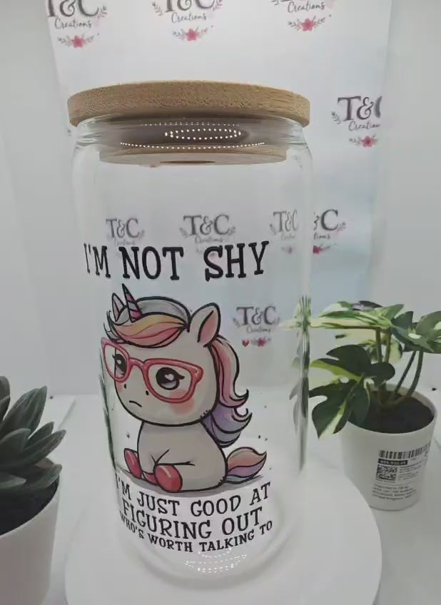 Make a bold statement with every sip. This 16-ounce glass tumbler pairs practical everyday functionality with unapologetic personality—featuring a hilarious unicorn decal that declares "I'm not shy." Whether you're enjoying your morning coffee or evening drink, this eye-catching piece transforms an ordinary moment into an opportunity to showcase your sense of humour. Durable, stylish, and impossible to ignore, it's the perfect gift for anyone who refuses to blend in.