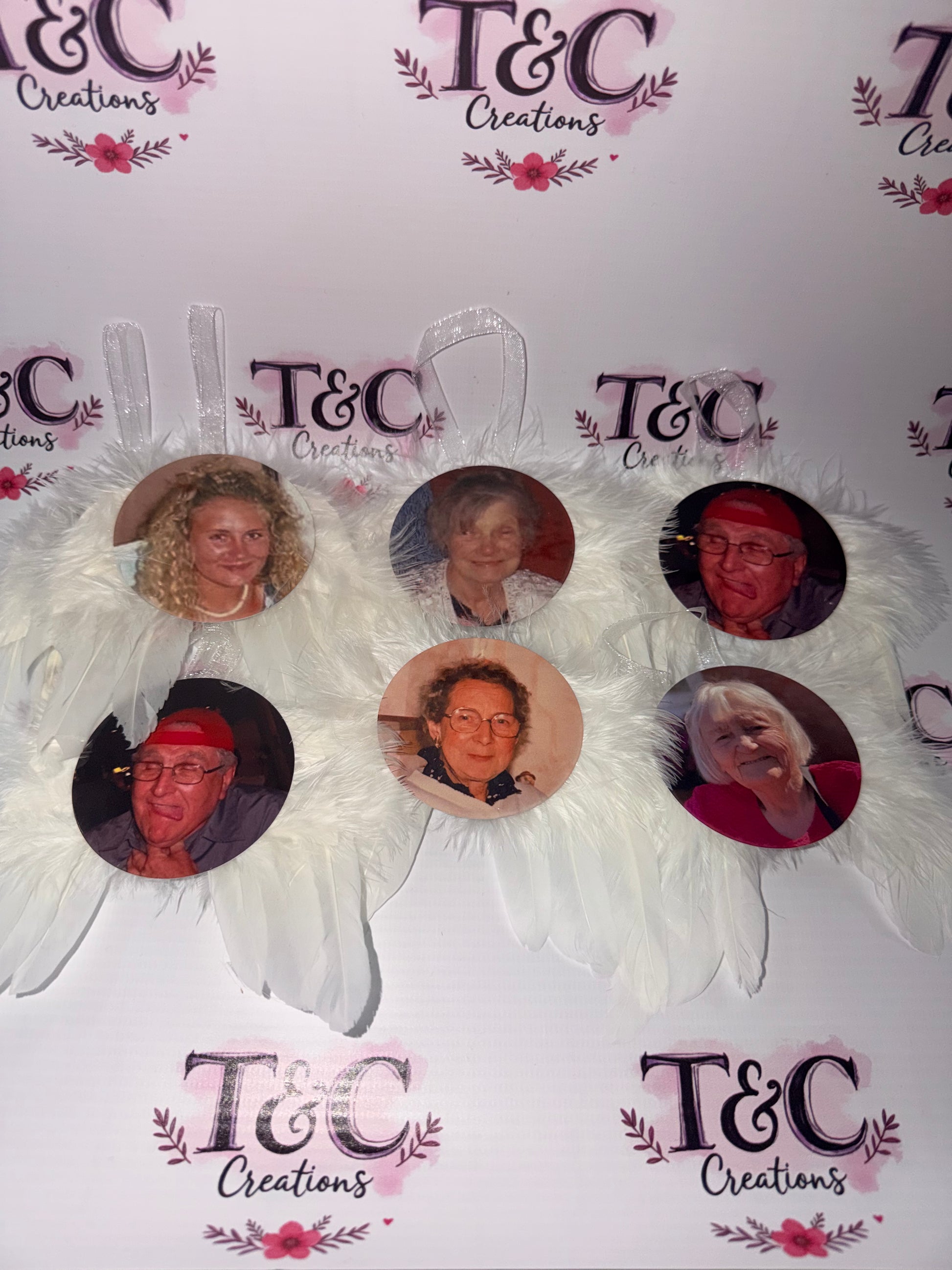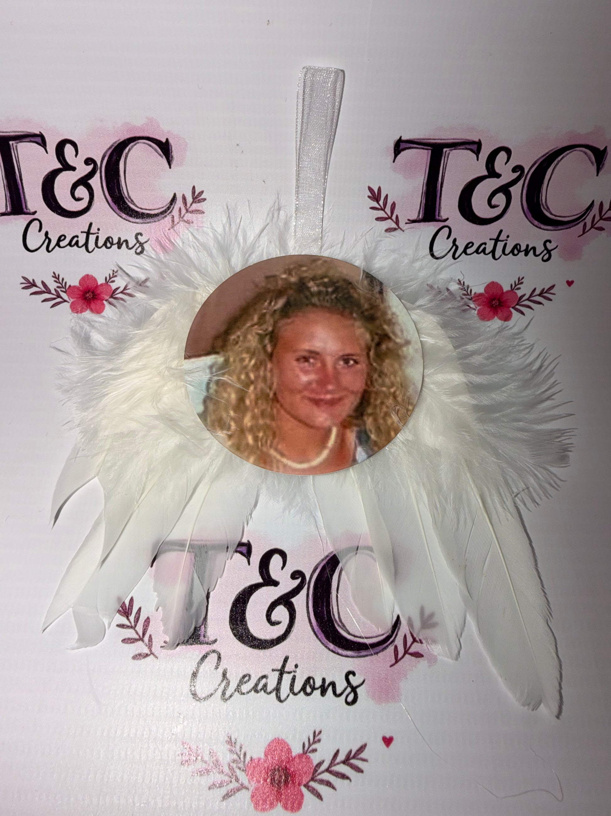 Celebrate the memory of someone special with this touching memorial piece featuring delicate feathered wings gracefully framing a cherished photograph. The elegant wing design symbolises freedom and eternal love, creating a meaningful tribute that honours your loved one. Perfect for your Christmas Tree, this keepsake becomes a beautiful reminder of the joy they brought into your life. A heartfelt way to keep their spirit close and their memory alive.